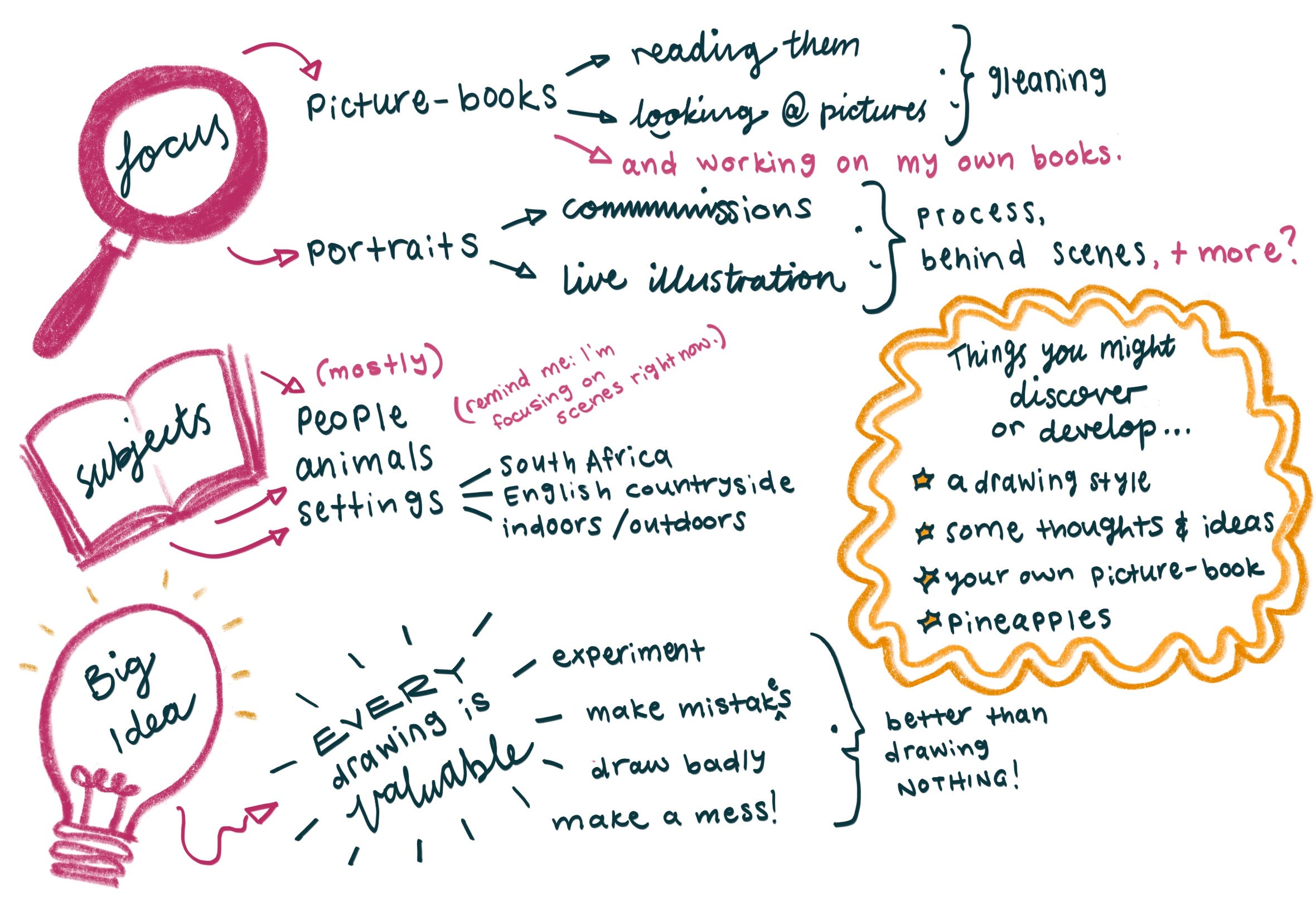 I’ve also created this mindmap to - hopefully - give you a better idea of the variety of things you’ll find in The Scribble Club: